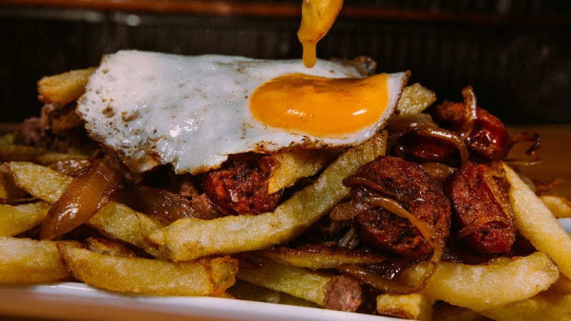 Las que puedes disfrutar con algunas de sus chorrillanas, con una base de papas caseras, delgaditas, como la tradicional ($ 16.990), con carne en trozos, choricillo, cebolla caramelizada y huevo frito.