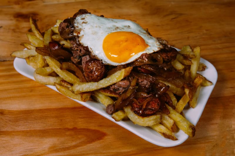 Además de la “Dos carnes” ($ 8.200), con papas fritas, longaniza, cebolla caramelizada, carne a la cacerola y un huevo frito.
