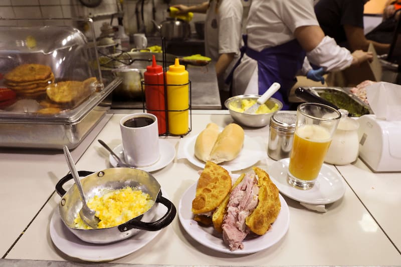 Y, las puedes pedir en un buen sánguche de pernil ($ 4.000), abundante y de muy buena calidad, al que le puedes agregar palta ($ 500). Más un café ($ 800), té con leche ($ 1.000) o Milo ($ 800), por ejemplo.