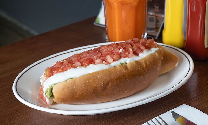 Pero sus completos no son menos icónicos. Con una vienesa de receta alemana, que mezcla carnes de cerdo y vacuno, la envuelve un pan propio, esponjoso y firme, selladas con una cremosa mayo propia.