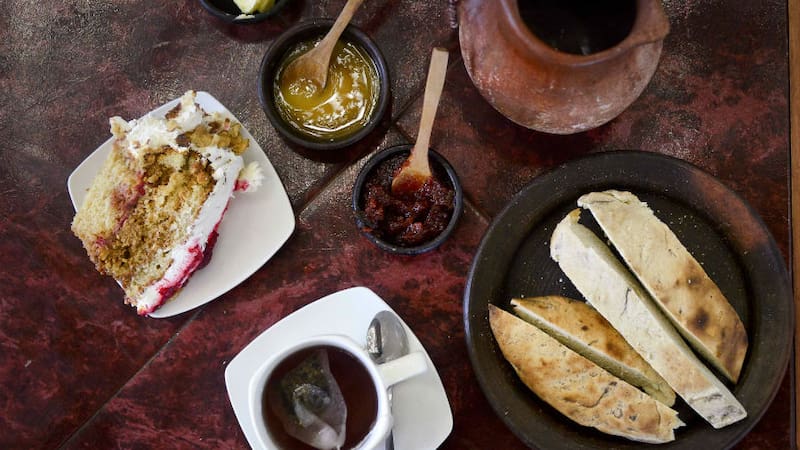 ¿Decidiste pasar en la tarde por esta cafetería mapuche? Entonces, siéntate a disfrutar de un café de higo y de un trozo de torta de manjar-nuez hecha con harina de piñones.