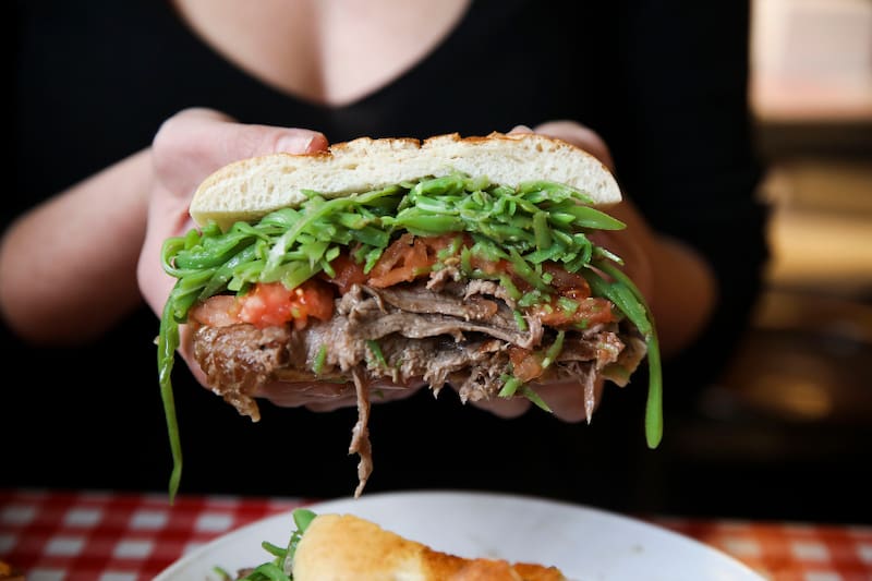También de los sánguches, en marraqueta doble, como la mechada chacarera ($ 5.000), mojadita con el jugo de la carne, y con porotos verdes.