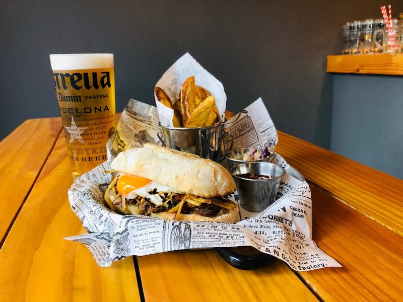 Por ejemplo, está la “mechada a lo pobre” ($ 7.280), que es un sándwich de carne mechada ahumada, más huevo frito, cebolla caramelizada y papas hilo hechas en casa. Todo en un pan ciabatta 100% artesanal.