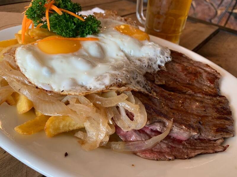 Ojo, que aquí el plato que llegará a tu mesa es un jugoso corte de lomo, en el punto que elijas y con una buena cantidad de papas fritas caseras. Eso más dos huevos fritos y cebolla caramelizada. Una delicia.
