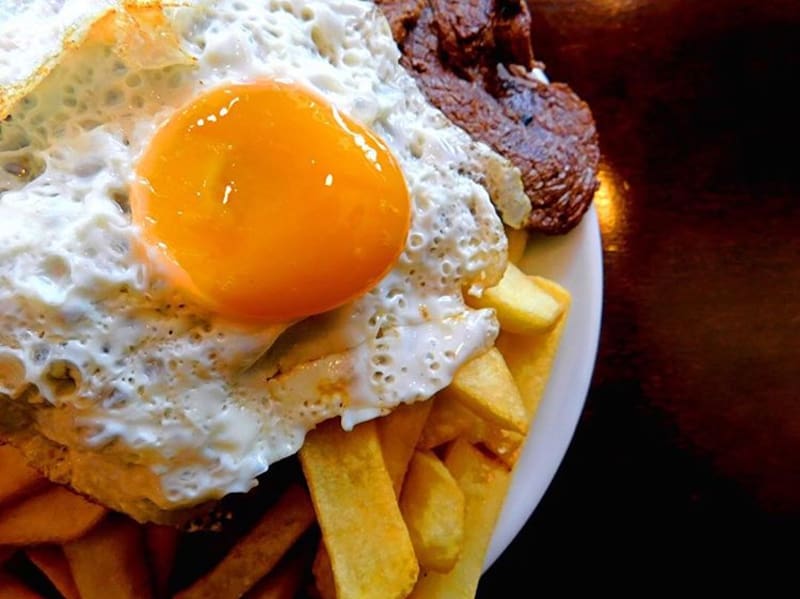 Es un plato que nació en 1870 en el local "Santiago" de calle Huérfanos y que sacaba suspiros y que los sigue sacando con sólo pensar en esos huevos de yema a punto listos para untar las papas fritas.
