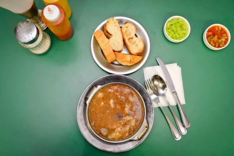 En esta fuente de soda, una de las más antiguas del centro de Santiago, se hace un caldo que ya es legendario, el “caldo de tronco” ($ 4.500, en la foto), que recibió ese nombre porque después de probarlo, se “cae como tronco” a dormir. Es bien denso, porque se hace con el caldo que se desprende de la cocción de la pierna de chancho y la de pavo, las mismas carnes que se usan para los suculentos sándwiches. Reponedor como él solo, lleva, además, un toque de vino y trozos de carne de cerdo y pavo para hacerlo saciador. Se dará cuenta de cómo se mantiene el calor en la paila metálica en que lo sirven, lo que siempre se agradece. No deje de pedir la marraqueta y el pebre de la casa que lo acompañan, porque hacen del plato algo perfecto.