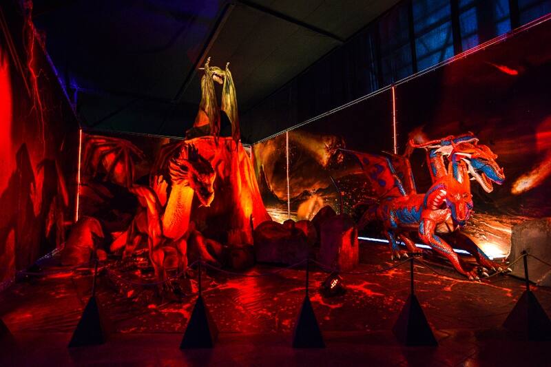 Luego el recorrido continúa con la zona más impresionate, una especie de carpa oscura en donde hay varias estaciones y donde los visitantes pueden apreciar de cerca a dinosaurios y dragones fantásticos juntos.