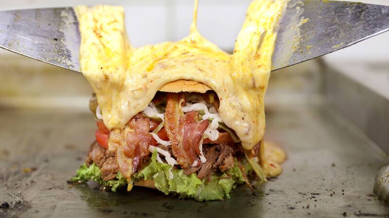 También El Volcán ($ 16.000), que ojo, son tres sánguches en uno, lleva mechada chacarera, lomito de cerdo con chucrut, plateada con cebolla caramelizada rebozada en huevo y, encima del pan, tocino más huevo frito. ¡Legendario!
