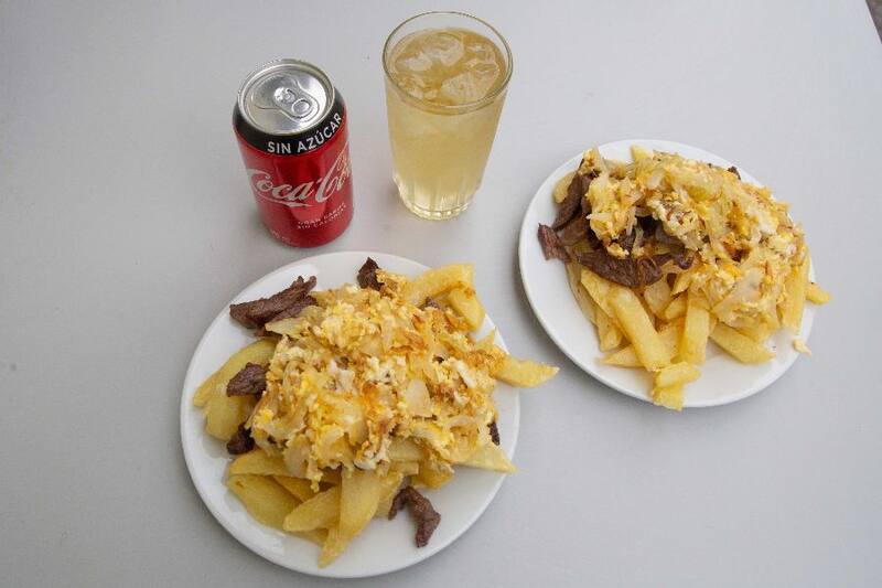 Y en la tarde lo que manda es la chorrillana ($ 6.000 para dos), que viene en platos separados, con papas fritas caseras, cebollita, churrasco y huevo frito.
