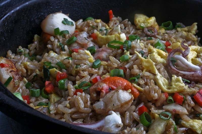 Prueba el chifa la mar ($ 15.800), que es un clásico arroz chaufa, con cebollín y huevo, con mariscos verduras y huevo.
