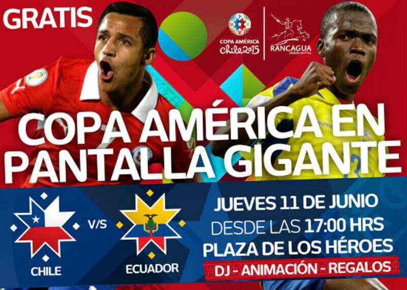 Malas noticias para los santiaguinos: por el momento, argumentando razones de seguridad, el clásico panorama de ver los partidos de Chile en la pantalla gigante del Paseo Ahumada no ha sido autorizado por la Municipalidad de Santiago. Buenas noticias para los rancagüinos: la capital de la VI Región si tendrá un evento público para apoyar a la Selección este jueves, con la instalación de una pantalla gigante en la Plaza de Los Héroes, donde se encuentra la Municipalidad, en un evento gratuito que partirá desde las 5 PM, con una previa que incluirá música, animación, y el sorteo de premios. Recordemos que Rancagua es además sede de la Copa, albergando en el Estadio El Teniente los partidos de Colombia vs Venezuela (domingo 14) y México vs Ecuador (viernes 19).