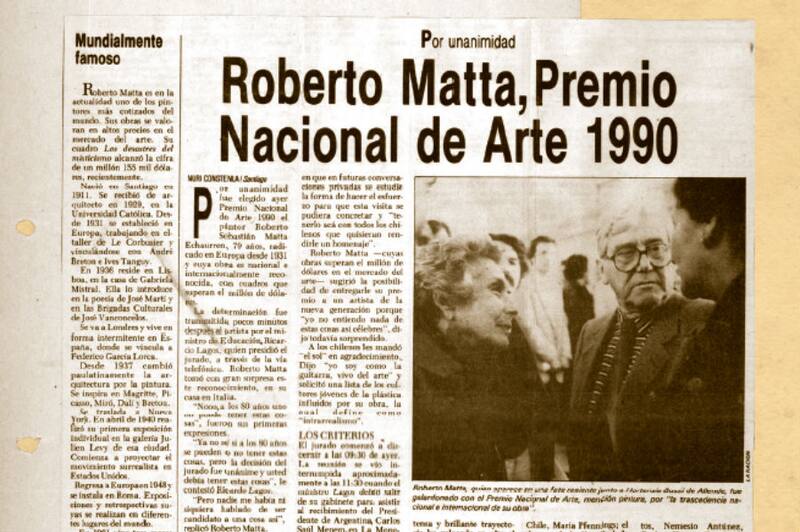 Por ejemplo, las notas que los diarios La Nación y Las Últimas Noticias publicaron cuando se le galardonó como Premio Nacional de Arte en 1990.