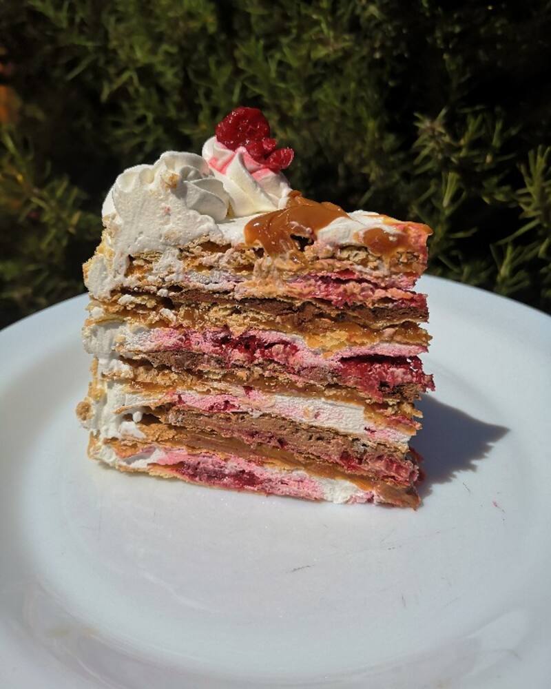 Nuestra favorita es la rellena de manjar con pastelera, frambuesa y cubierta de crema chantilly. Deliciosa.