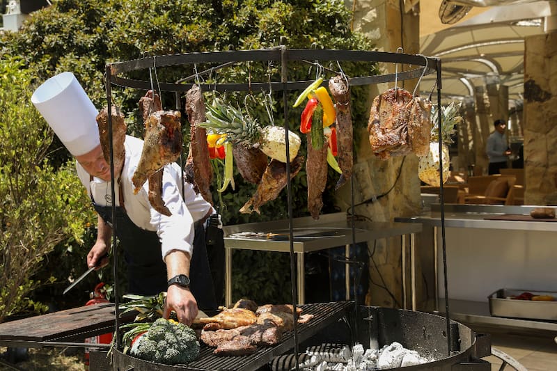 Es más, son variadas las alternativas para elegir, aunque una de las estaciones más atractivas, es la de los fuegos donde podrás ver y elegir entre varios cortes como filete, en el punto que tu elijas, y que puedes pedir con salsas como chimichurri o pebre por ejemplo, acompañado con el pan de la casa.