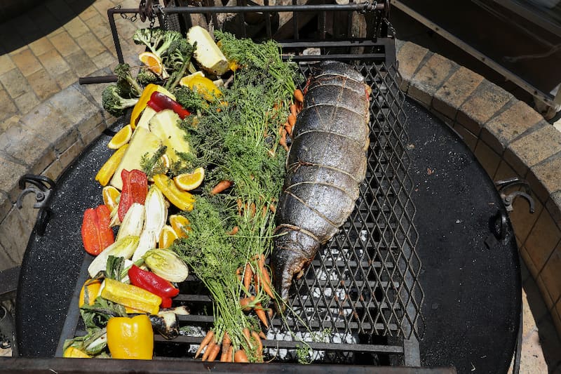 Otra alternativa es que pruebes el pescado a la parrilla, que puede ser trucha por ejemplo. Junto con la estación de ensaladas y guarniciones que constantemente se va reponiendo.