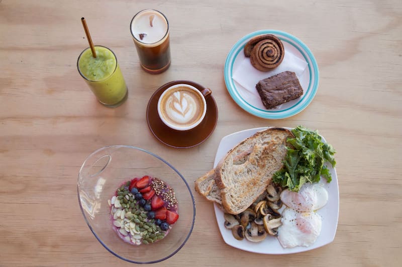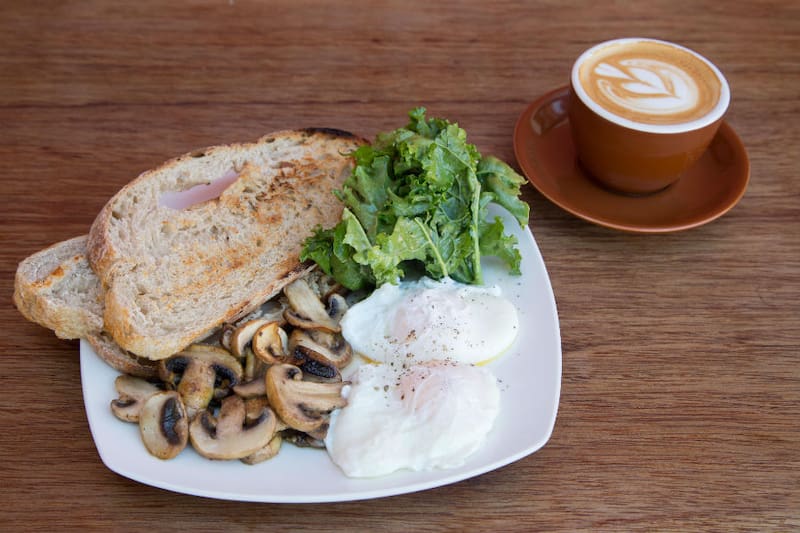 Por ejemplo, el que lleva una paila de huevos revueltos o pochados con ciboulette (tú elijes cuál prefieres), champiñones y frescas hojas de kale en pan tostado de masa madre casero ($ 3.500).
