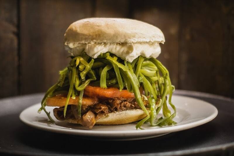 También está el sánguche de "pulled pork", con tocino, queso cheddar, cebolla crocante, pepinillo, lechuga, cilantro y mayonesa chipotle,