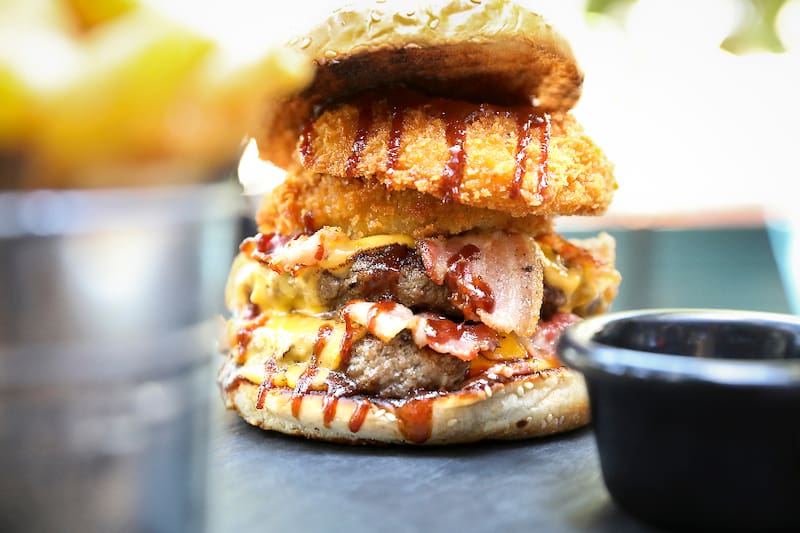 O la Doble infierno ($ 13.500), que es una doble hamburguesa casera, con doble queso, aros de cebolla apanados y salsa barbecue.