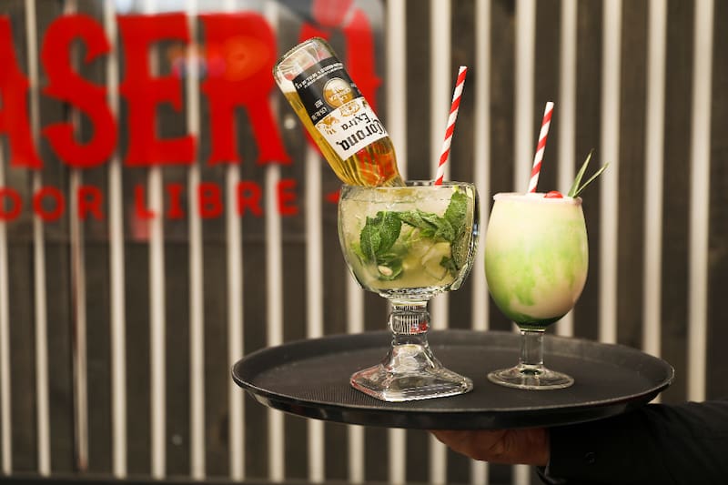 Así es que para acompañar las carnes y los platos te encontrarás con coctelería especial, como el Mojito Corona ($ 5.990), que tal como ves en la foto viene con una cerveza, que va cayendo mientras vas tomando tu mojito.