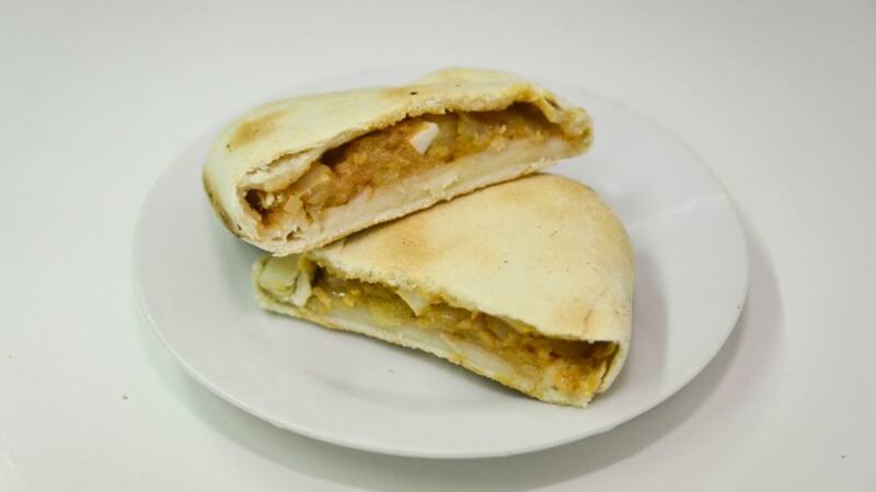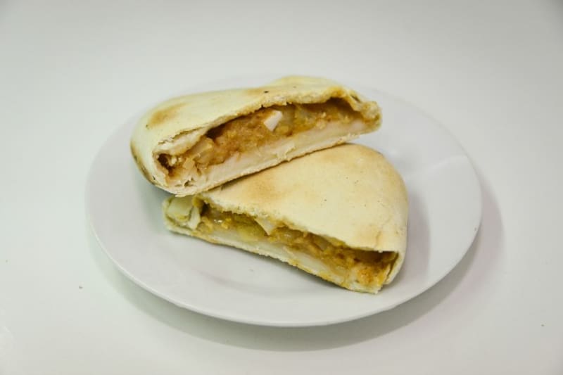En realidad, si bien la masa es distinta, no está la infraestructura para uslerearla a mano como lo hacía el pequenero, Benito Conavil, por tanto es más delgada que la original, el relleno es el mismo. Cebolla cruda con un toque de ají color y un trocito de huevo duro.