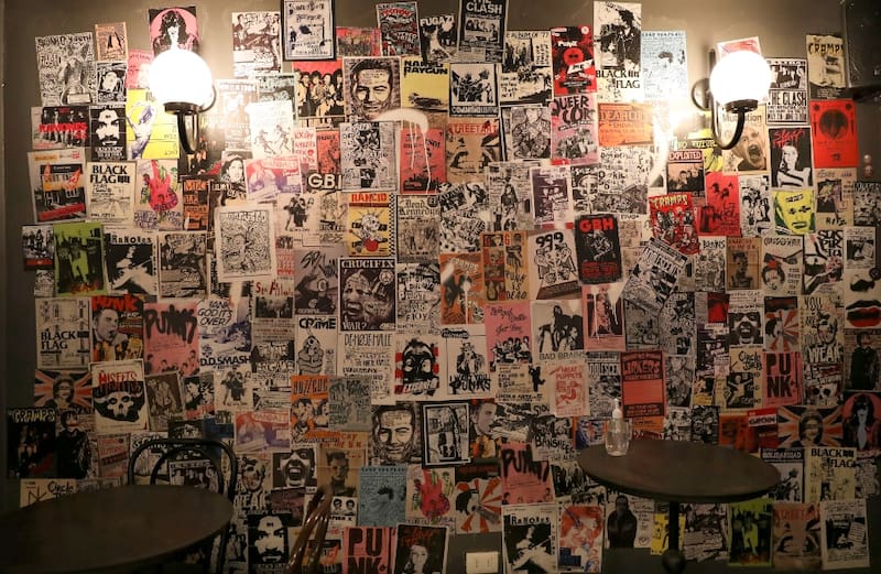 Como neumáticos, escopetas, machetes y hasta una cama colgando del cielo de uno de los salones, junto con fotos y afiches de bandas emblemas del punk, el hardcore y el rock, como Buzzcocks, Rancid, Misfits, The Cramps, The Clash, Fugazi y Black Flag.