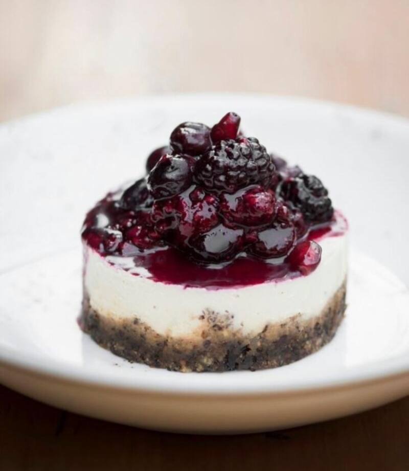 Y ojo que hay buenas opciones de postres veganos, como el cheescake ($ 4.600, en la foto), con castañas de cajú, pasas y salsa de frutos rojos, endulzado con panela.