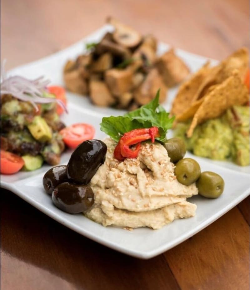 ($ 9.900), ideal para compartir, que viene con pan pita, ramitas de zanahoria, guacamole, chips, aceitunas, tomates cherry, champiñones salteados, tofu con semillas, jengibre y ceviche de algas.
