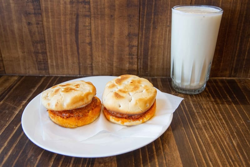 Los puedes pedir por separado, a $ 700 el choripán y $ 1.100 el vaso de leche con plátano, pero también en promociones como la "Torres del Paine" ($ 2.300), que trae dos choripanes más la leche con plátano.