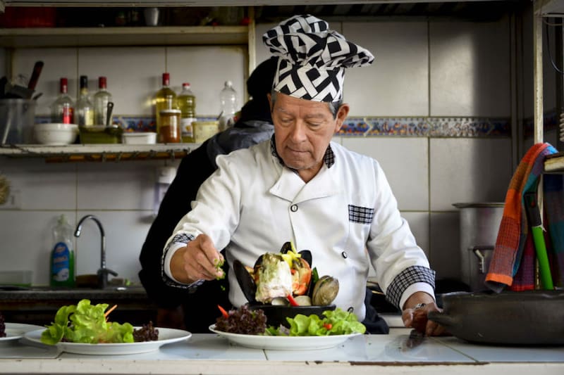 A sus 76 años, es él quien sigue cocinando de viernes a domingo. ¿Su especialidad? La paila marina ($ 6.000), un caldo enjundioso, con choritos maltones, almejas, camarones y anillos de calamar, más un toque de crema y chorrito de vino blanco.