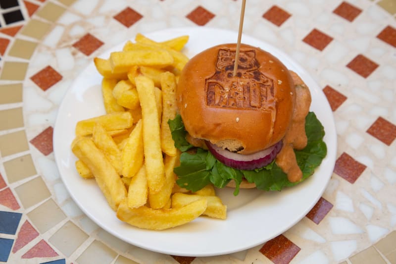 En El Mundo de Dalí también hay opciones saladas, como una hamburguesa ($ 9.900) que puede ser vegetal o de carne, con lechuga, cebolla y salsa especial, acompañada de papas fritas y un jugo natural.