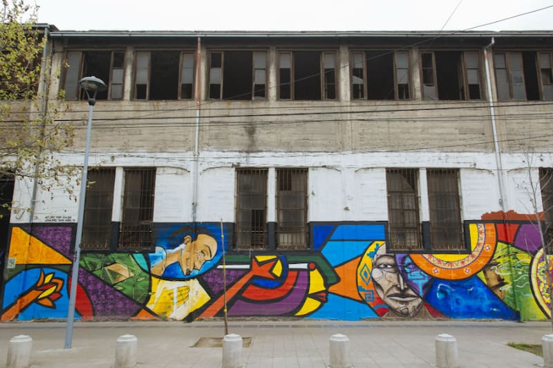 Si después te vas a la fachada de calle San Isidro, te encontrarás con la obra de Daniel Marceli, artista de Valparaíso que pintó aquí su obra más importante en Santiago.