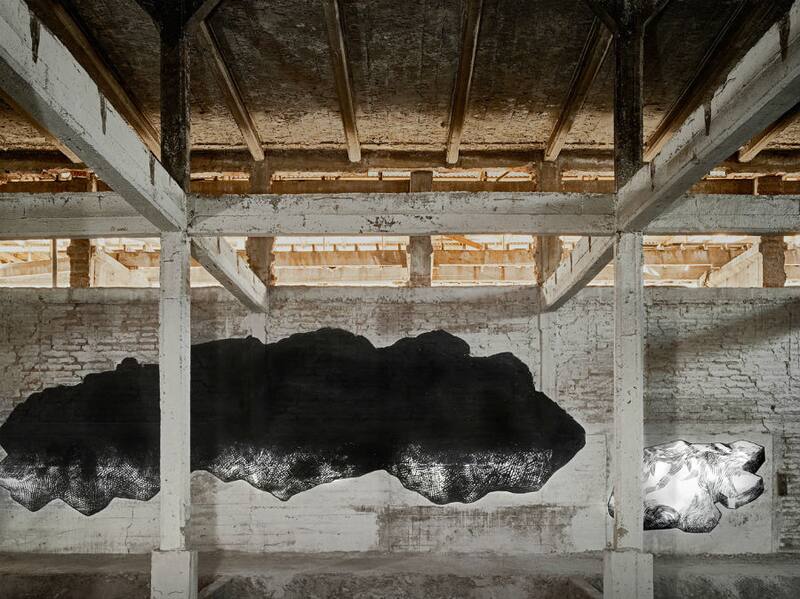 Es una obra en blanco y negro, que tiene figursa sinouosas y otras geométricas, que se extiende por los muros y pilares, y que en conjunto generan la sensación de tridimensionalidad.