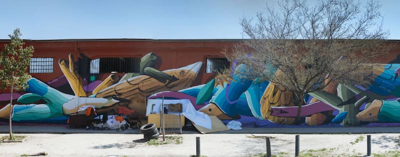 Este mural, que combina figuras abstractas, cuerpos humanoides y objetos que se pueden encontrar en el persa, lo pintó en 2017 Basco Vasko, grafitero chileno reconocido mundialmente, incluso en Nueva York, la cuna del grafiti.