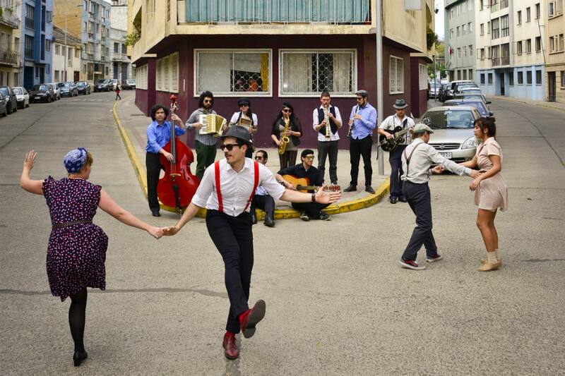 Son las 3.30 PM de un domingo cualquiera en el Parque Bustamante. De repente, casi de la nada, detrás del Café Literario, aparecen unos músicos con contrabajos. Luego, otros con guitarras, saxos y clarinetes. Por último, se suma un grupo de bailarines vintage, con suspensores y vestidos de lunares. Juntos, en menos de media hora, arman un jam de swing, un festivo espectáculo de música y baile que, de inmediato, llama la atención de los visitantes del parque.