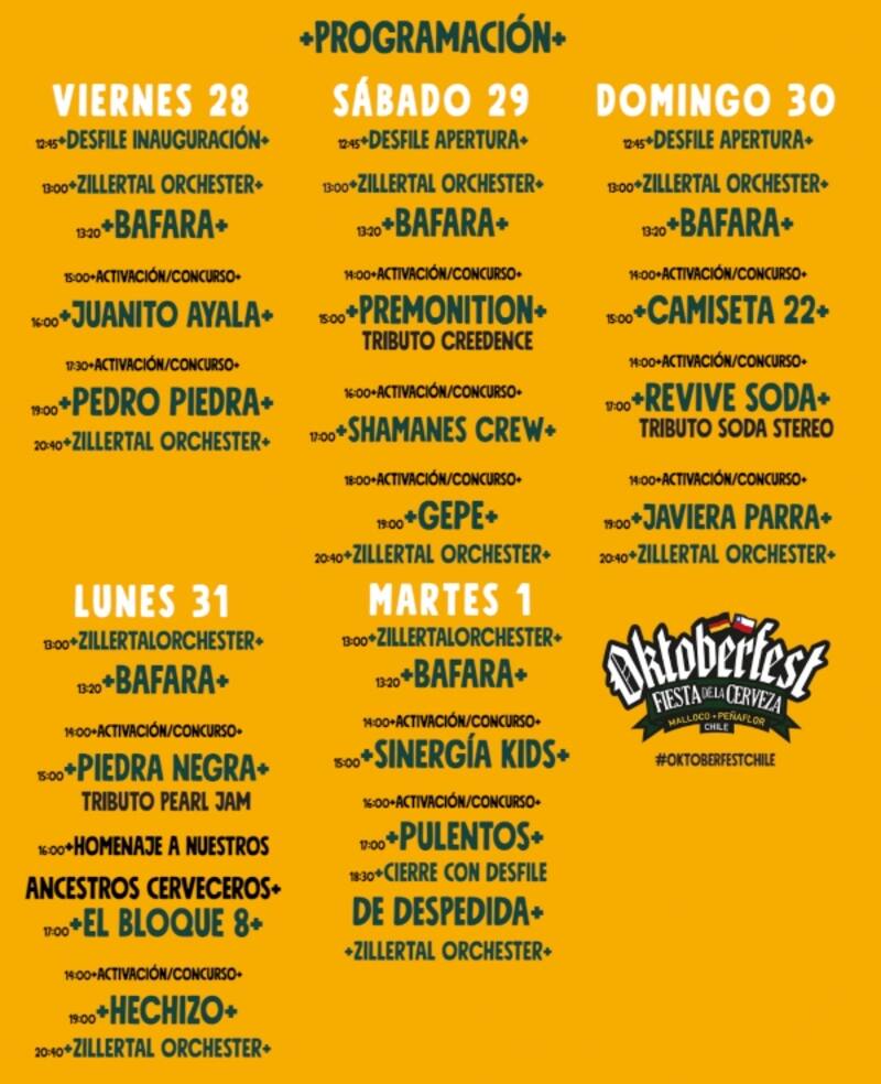 Evento que después de tres años vuelve en grande, con nada menos que con cinco días de fiesta, música en vivo, tradiciones y miles de litros de cerveza, desde el viernes 28 de octubre al martes 1 de octubre.