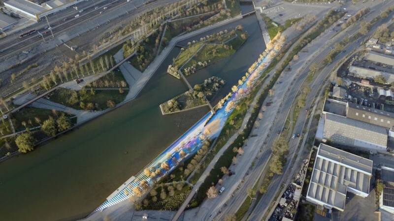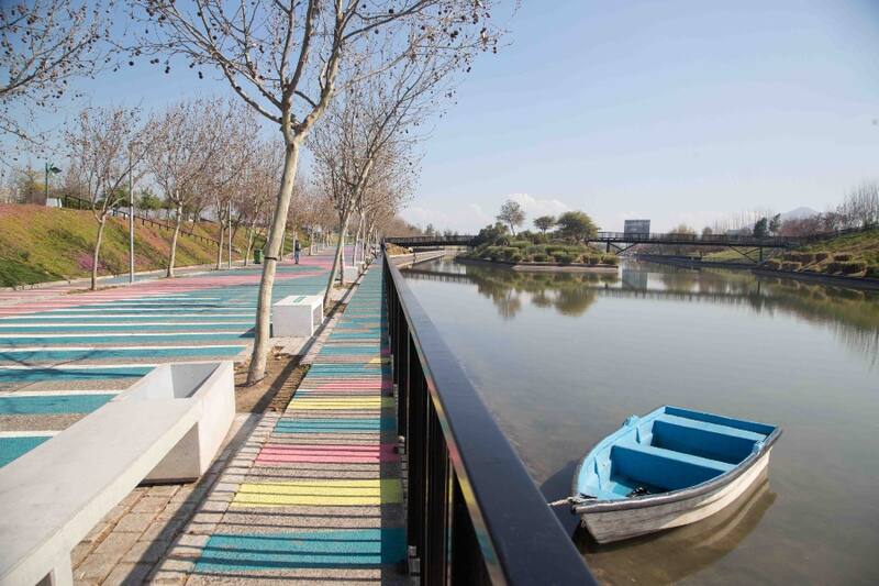 Además, la misma naturaleza del parque y el brazo del Mapocho que hay en su interior fue otra de las que influyó en el diseño, ya que también se inspiraron en las huellas que dejan los desbordes naturales de los ríos.