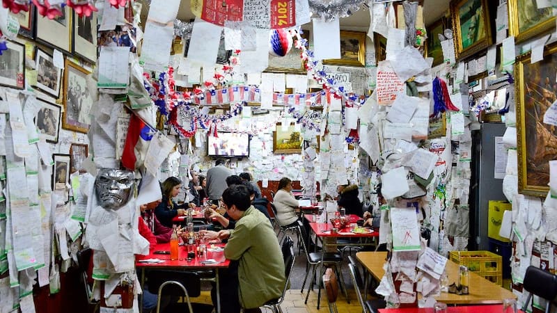 Por el momento sigue estando en pleno centro de Santiago, con su decoración cargada de notas, dedicatorias y papelitos dejadas por sus clientes.