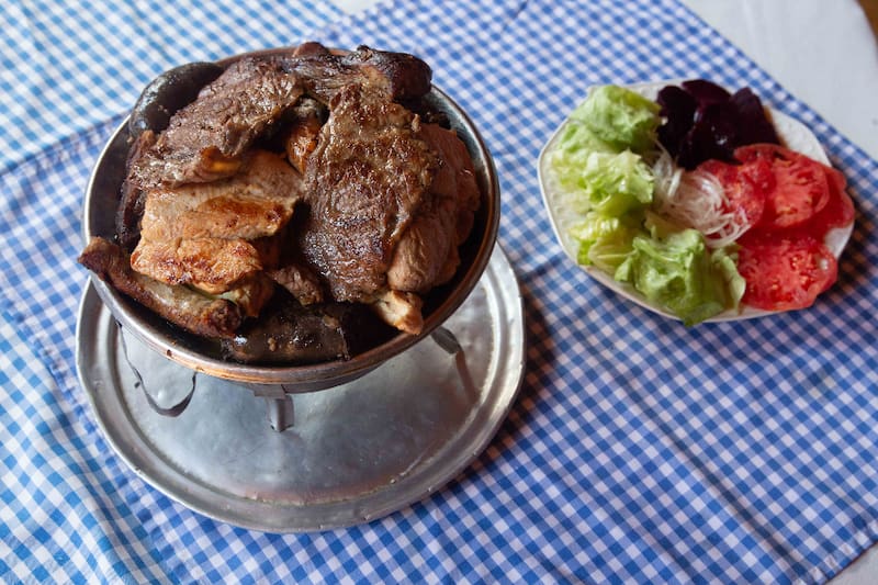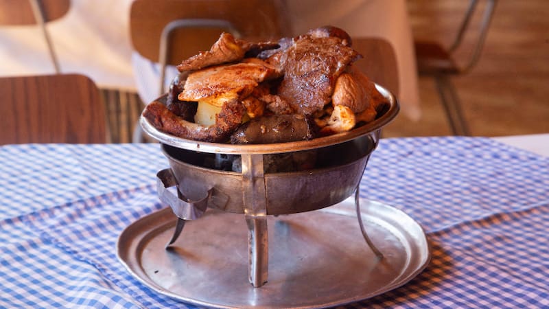 Si buscas parrillada, encuentras una para dos ($ 34.500), con costillar, longaniza, chuleta, prietas, lomo y pollo, que llega con papas cocidas y ensalada surtida.