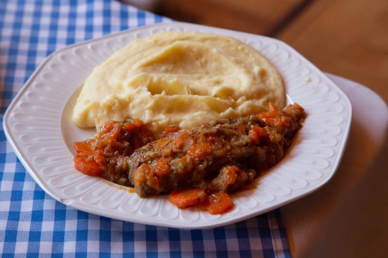 Puede tocarte chuleta de cerdo, con puré y arroz por ejemplo, o una blandísima carne a la cacerola, con puré, bien casero.