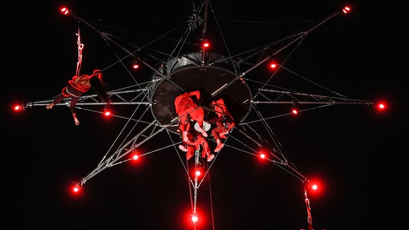 Ahí, un grupo de artistas, entre acróbatas y bailarines, sorpenderán con acrobacias y hazañas que desafían el vértigo, con las que descienden desde las alturas para irrumpir entre el público.