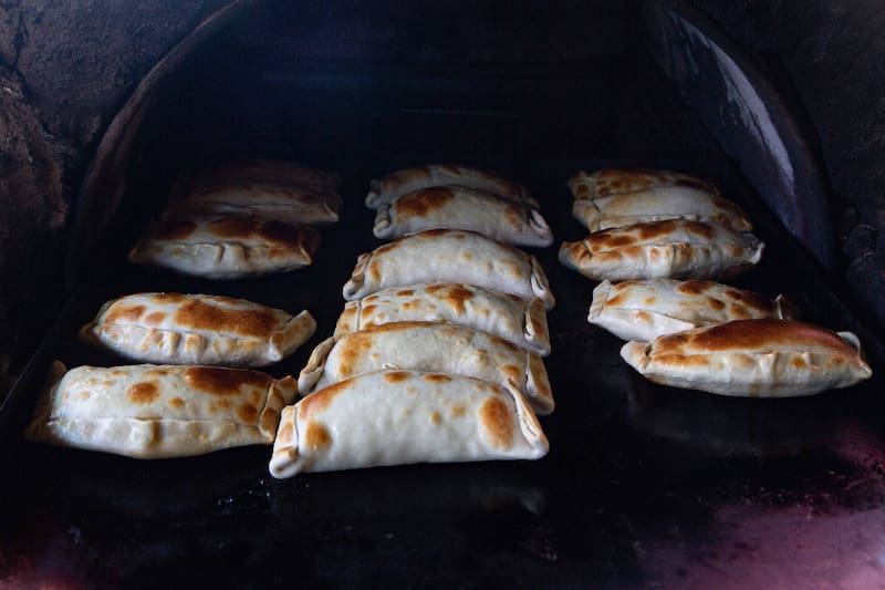 También es una empanada de buen tamaño, cuya masa dorada, que hacen ahí mismo todos los días, alcanza en el horneado ciertas marcas café oscuro, moteada como un leopardo, que le dan un aire todavía más casero.