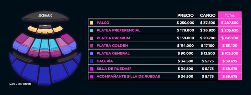 Los valores parten desde los $ 39.675 (cargo por servicio incluido) que cuesta la emblemática galería hasta los $ 287.500, que es el precio del privilegiado palco.