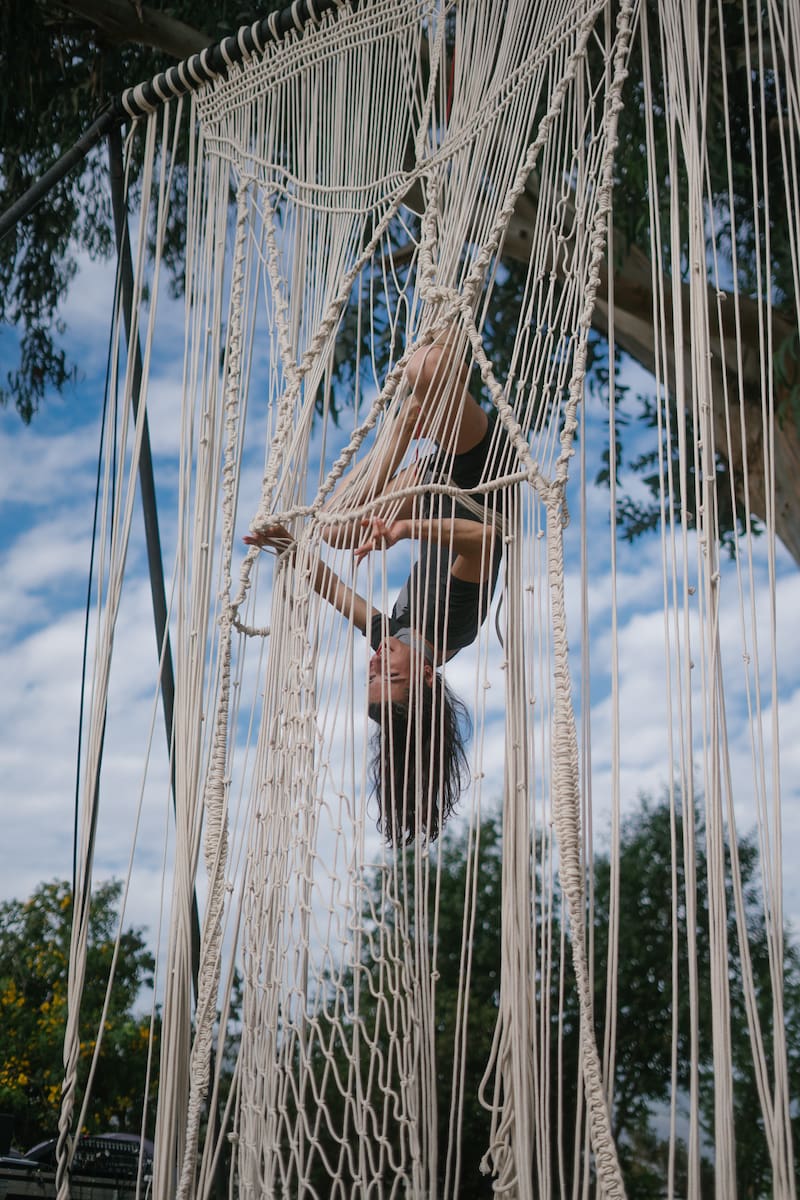 “La pieza se desarrolla en una gran estructura textil instalada en escena, donde las intérpretes tejen con su propio cuerpo, combinando danza, teatro y circo. Se trata de una propuesta poética que recorre distintos universos narrativos ligados a lo textil, evocando el rito de tejer y proponiendo el tejido como una metáfora de la vida”.
