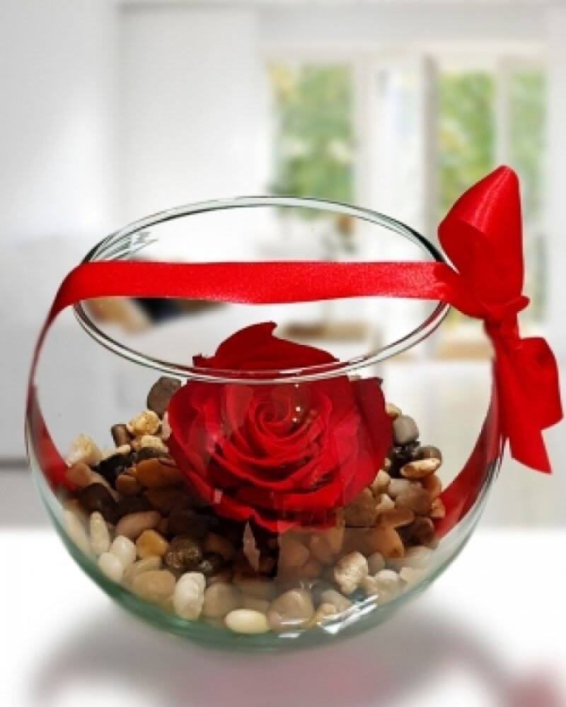 Una rosa de éstas, en una pecera de vidrio con piedras de río, cuesta $ 24.990.
