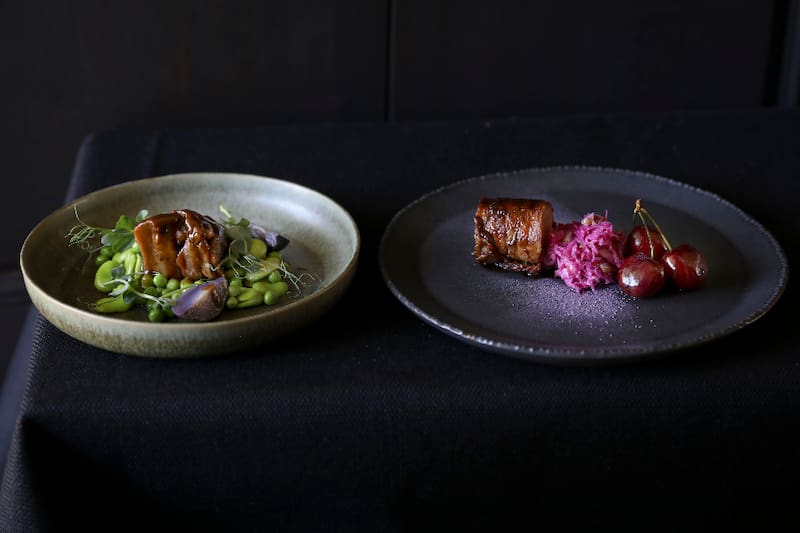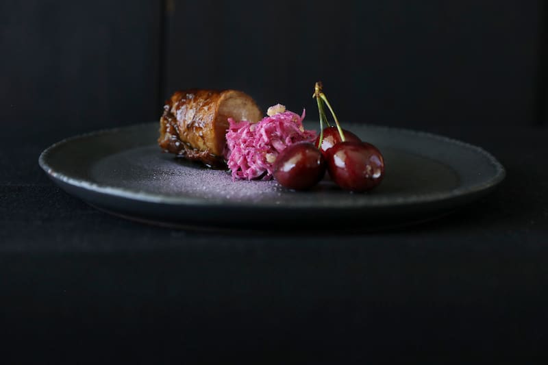 Otro de los momentos estelares de este menú es el solomillo, envuelto en tocino, con ensalada de repollo morado y aderezo de labneh con cerezas al sartén, sincronía perfecta, acompañada por el Carmenere Single Vineyard, del Valle de Colchagua.