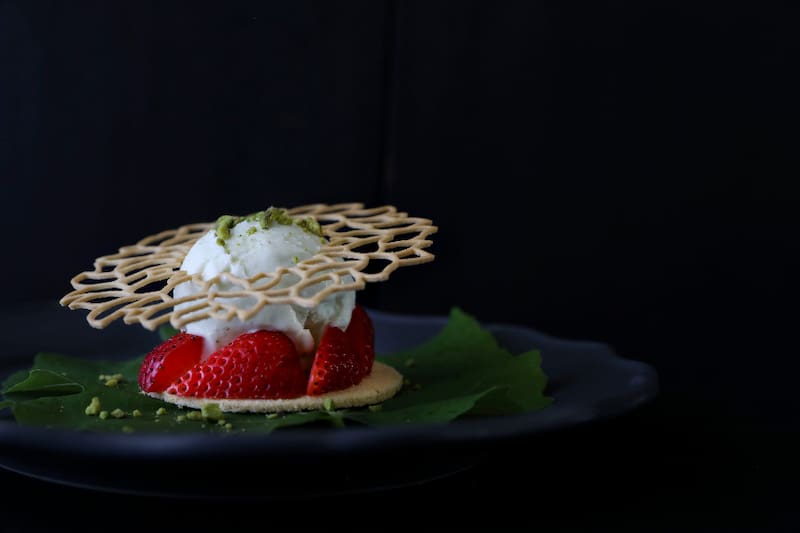 Finalmente, los postres. Partiendo por el helado de hojas de la higuera, tan sutil como delicado, con pistacho y frutillas frescas.