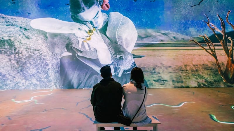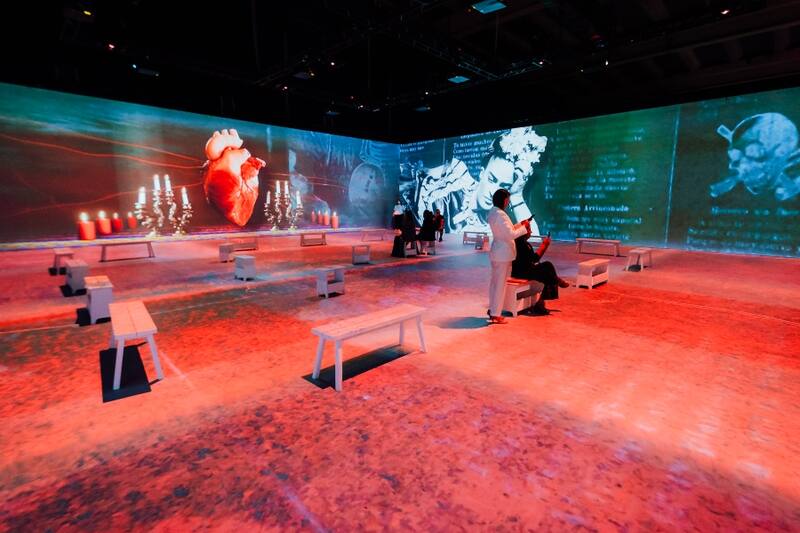 Y es que su biografía se presenta en una experiencia que tiene distintos espacios, partiendo por salones con más de 1.000 m2 de pantallas y en donde sus cuadros, como sus famosos autorretratos, se proyectan de manera digital tanto en las paredes como en el suelo.