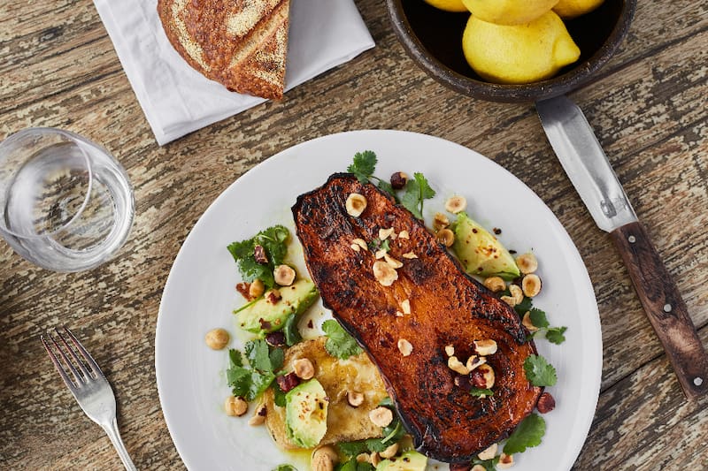 Un placer a la vista donde no todo es carne. De hecho, los vegetales son los protagonistas de las entradas, como las alcachofas ($ 8.000), el tierno corazón, con habas, arvejas, menta y piel de limón; o el zapallo al horno de barro ($ 9.500), una delicia que se deshace en la boca con raclette, palta, cilantro y avellanas.