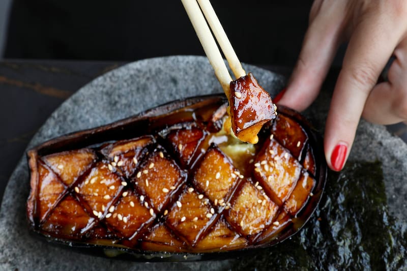 Y si se trata de las entradas calientes, las Gyosas de cordero ($ 12.500), son una delicia, cocinadas al vapor y selladas en la plancha, con un relleno de cordero y foie; o la Nasu miso ($ 12.500), que es una berenjena asada y glaseada en salsa miso, nori, arroz y sésamo.