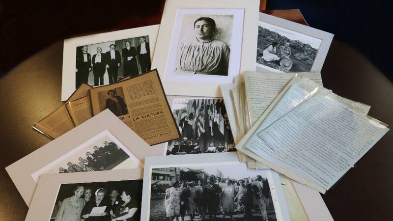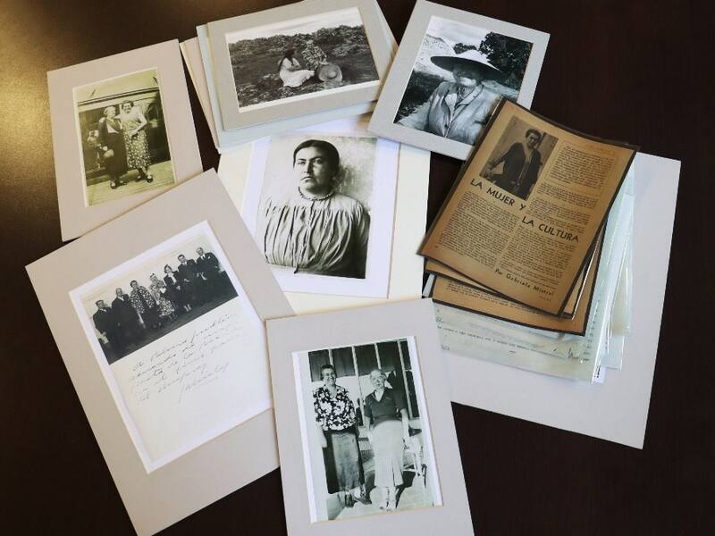 La muestra se compone de material fotográfico de Mistral, artículos, libros y manuscritos pertenecientes a los archivos de la biblioteca. Por ejemplo, una foto de 1938 en que se le ve junto a la poetisa argentina Alfonsina Storni en un encuentro de poetisas en Montevideo, Uruguay.